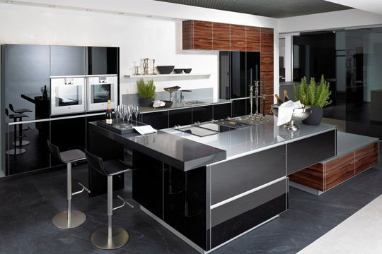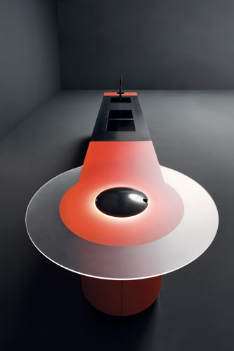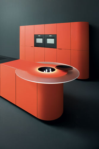 Couleur vitaminée pour cette cuisine au design résolument moderne et originale, primée du Good Design Award 2009. Blanc opaque, jaune, vert, bleu, argent métallisé, orange, elle affiche la couleur pour contraster dans la bonne humeur et le raffinement avec le noir des zones de préparation et de cuisson. Elle se caractérise par son îlot et ses colonnes en verre acidifié et son plan de travail en verre très fin qui offre un coin repas tout en rondeur. Au centre de celui-ci, les boissons peuvent être stockées dans la zone de rafraîchissement. La calotte sert de couvercle et, renversée, peut s’utiliser comme saladier. Une cuisine pleine de personnalité et d’élégance !