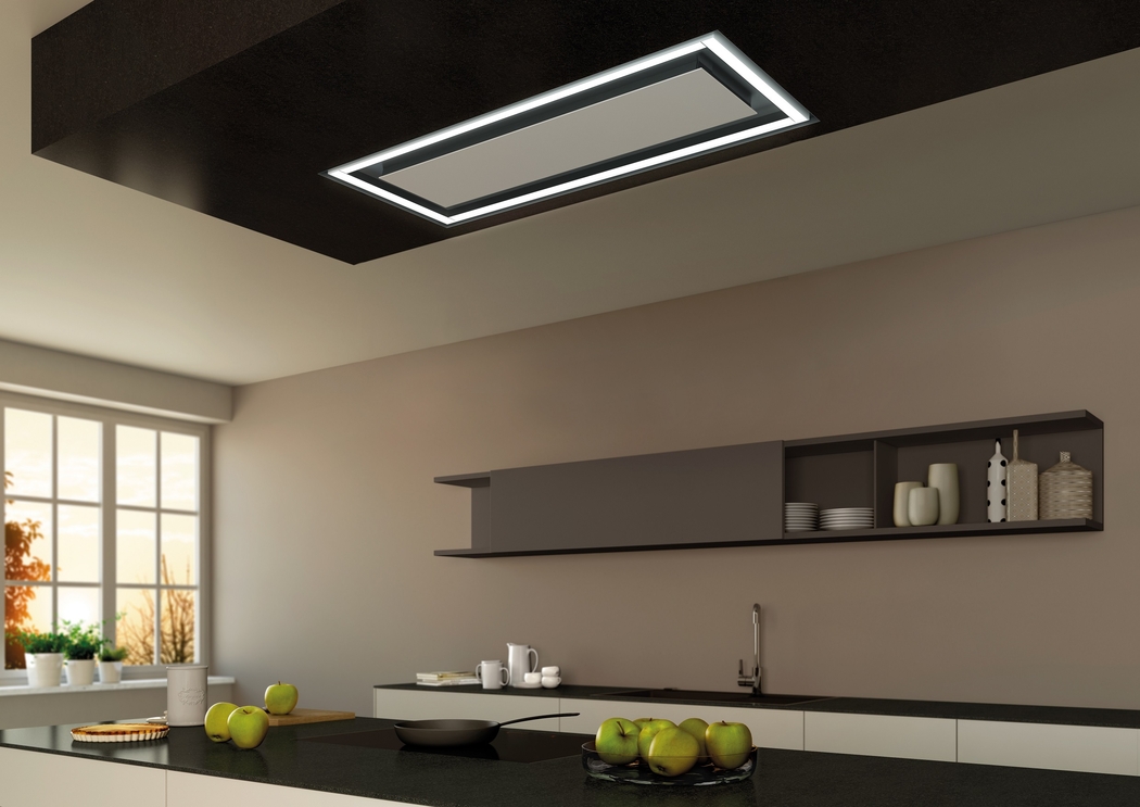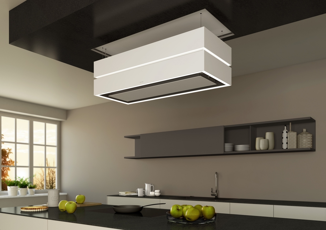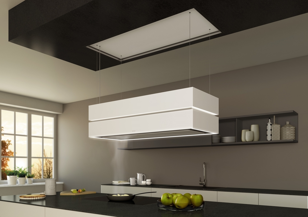 Die zweite Generation der Deckenlifthaube Skyline Edge vereinigt alle Ansprüche an Technik und Design. Bereits die Grundversion kommt per Fernbedienung elegant von der Decke gefahren. Die Höhenverstellbarkeit wurde auf bis zu 1.200 mm erweitert. Mit der neuen Teach-Funktion stoppt die Haube automatisch auf der optimalen Arbeitshöhe und entfaltet dort ihre volle Wirkung.
