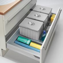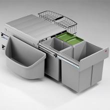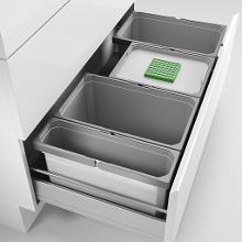 Variantenvielfalt mit System: Abfallbehälter sind heute lieferbar für alle Schrankbreiten, mit verschiedenen Behälterhöhen. Durchgehende Deckel, teilweise aus Metall, optional Biodeckel mit Aktivkohlefilter. Kombinierbar mit Putzmittelauszügen und Utensilienschalen.